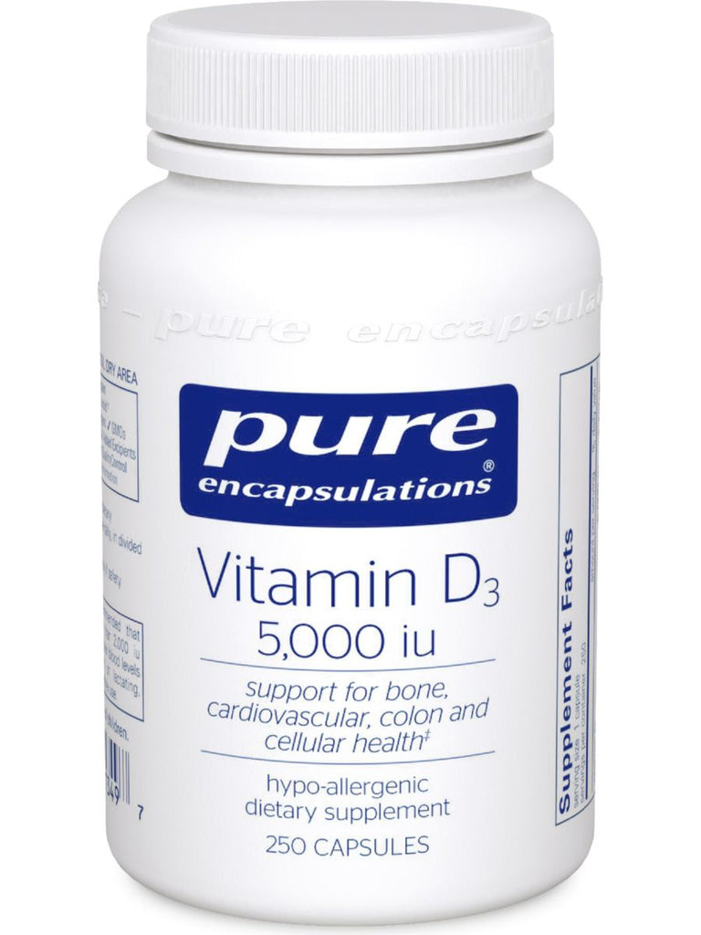 Pure Encapsulations Vitamin D3 5,000 IU contain 5000 IU of vitamin D3 in each easy-to-swallow vegetarian capsule. This provides a high dose of this essential nutrient for bone, colon, cardiovascular health and general wellbeing.