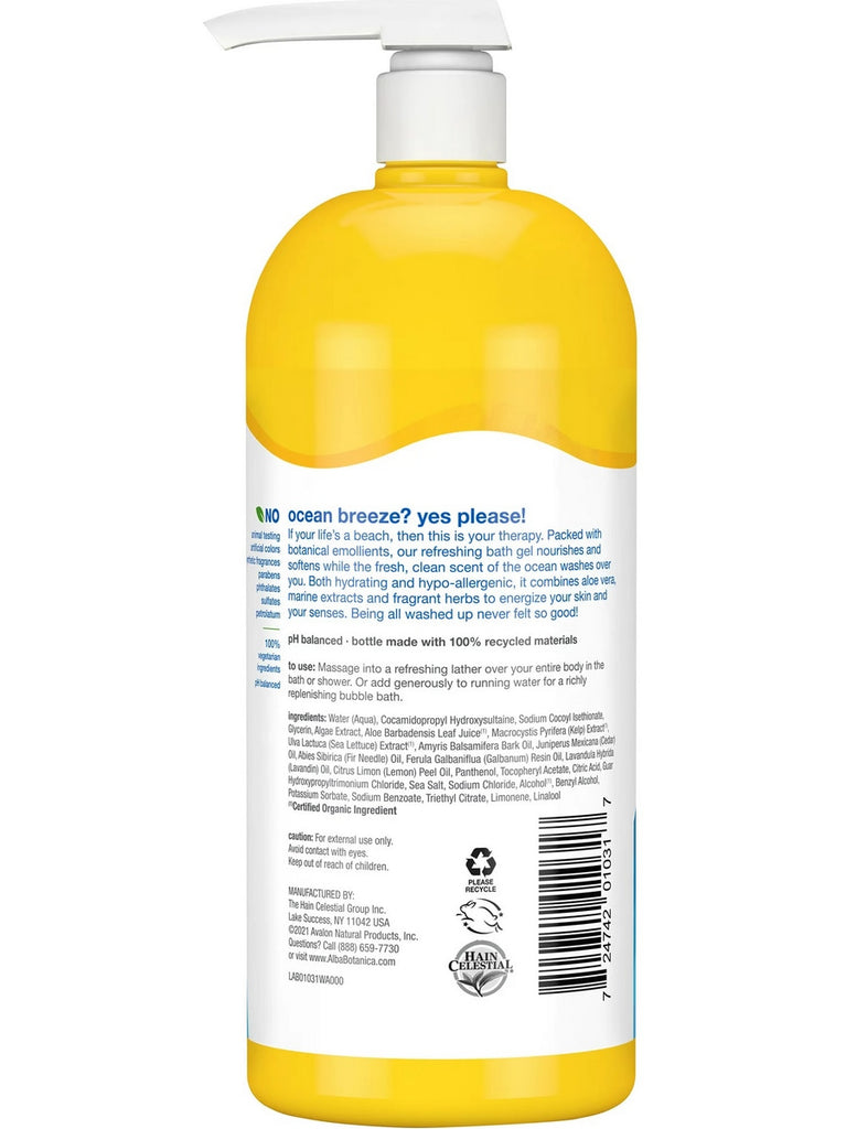 If your life’s a beach, then this is your therapy. Packed with botanical emollients, our refreshing bath gel nourishes and softens while the fresh, clean scent of the ocean washes over you. Both hydrating and hypoallergenic, it combines aloe vera, marine extracts and fragrant herbs to energize your skin and your senses. Being all washed up never felt so good!
