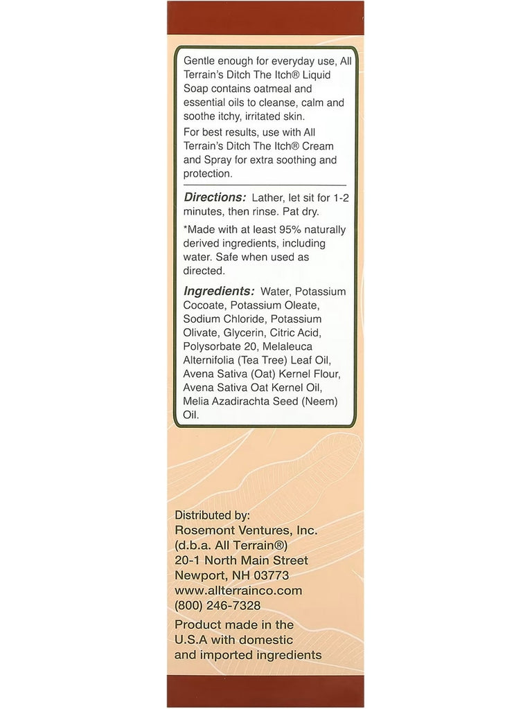 Gentle enough for everyday use, All Terrain's Ditch The Itch Liquid Soap contains oatmeal and essential oils to cleanse, calm and soothe itchy, irritated skin. For best results, use with All Terrain's Ditch The Itch Cream and Spray for extra soothing and protection.