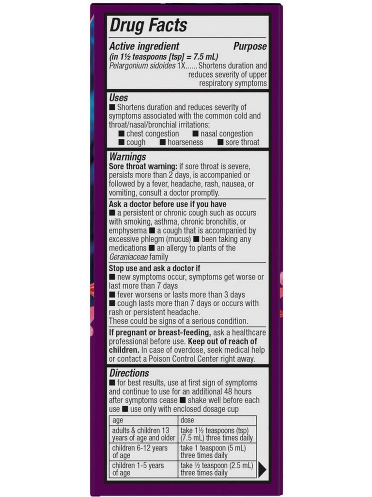 Umcka ColdCare Syrup contains the homeopathic active ingredient Pelargonium sidoides 1X and is clinically proven to shorten the duration and reduce the severity of common cold symptoms like cough and congestion, plus throat, nasal, and bronchial irritations. Umcka does more than just relieve your symptoms — it actually speeds your recovery time. This soothing syrup is non-drowsy, so you can take it whenever you need it most.