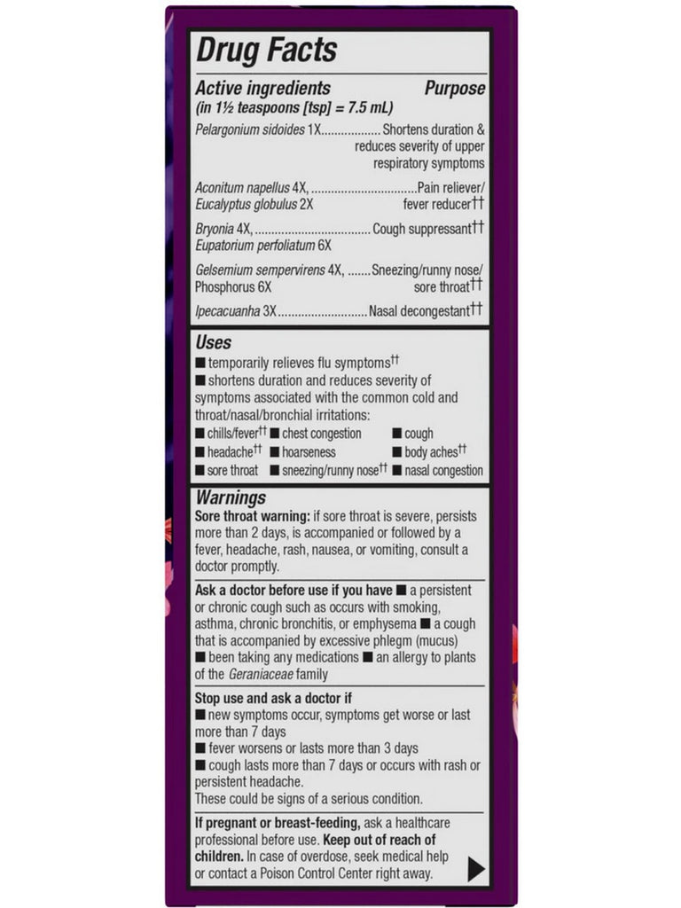 Don't just soothe your cold and flu symptoms — alleviate them with Umcka Cold+Flu Syrup. Umcka shortens duration and reduces severity of symptoms associated with the common cold and throat/nasal/bronchial irritations. Our Alpha® CF blend provides multi-symptom relief of colds and flu. Non-drowsy. For ages 6+.