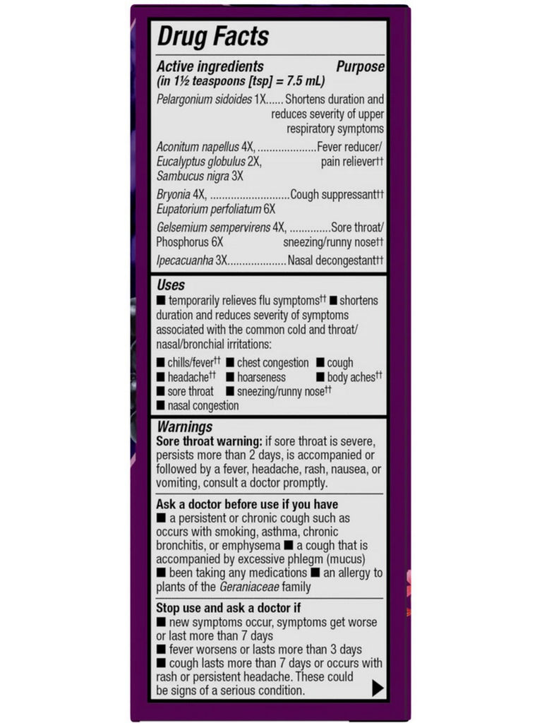 Don't just soothe your cold and flu symptoms — alleviate them with Umcka Cold+Flu Syrup. Umcka shortens duration and reduces severity of symptoms associated with the common cold and throat/nasal/bronchial irritations. Our Alpha® CF blend provides multi-symptom relief of colds and flu. Non-drowsy. For ages 6+.