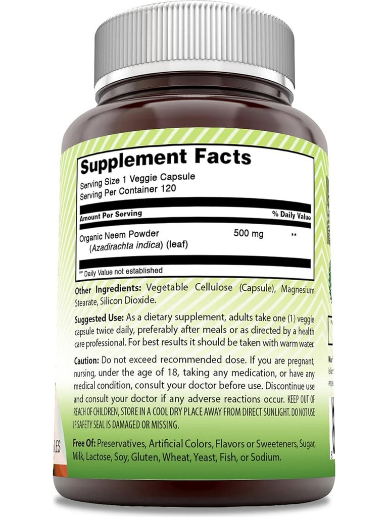 Amazing India Neem dietary supplement is made from neem leaves. Harvesting the Neem leaves does not harm the fast-growing tree. Some of its benefits are: