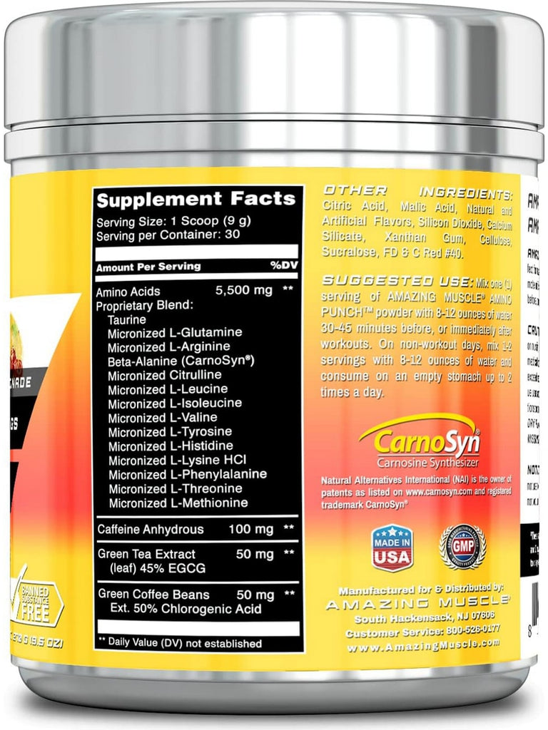 Mix 1 serving of AMAZING MUSCLE AMINO PUNCH powder with 8-12 ounces of water 30-45 minutes before or immediately after workouts. On non-workout days, mix 1-2 servings with 8-12 ounces of water and consume on an empty stomach up to 2 times a day.