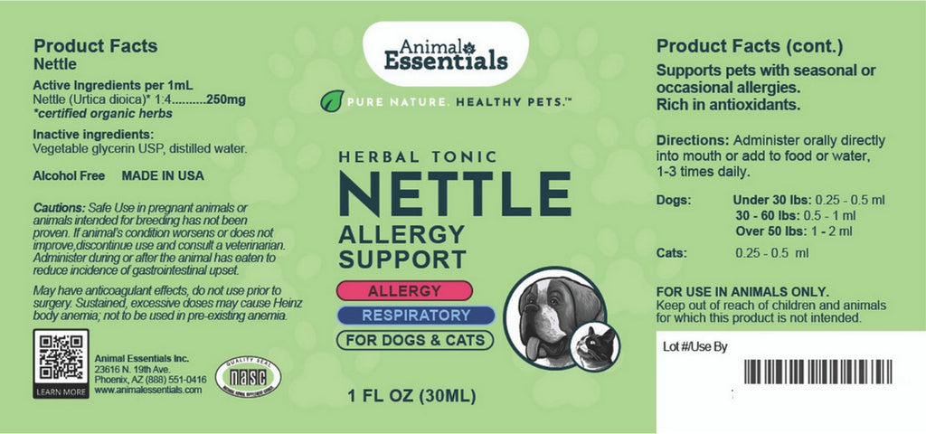 Considered a primary "go-to" tonic herb by many herbalists, nettle is well known for its rich diversity of trace minerals, vitamins, antioxidant chlorophyll, and plant histamine constituents that support healthy modulation of immune responses to seasonal allergies. It is a key component of our Seasonal Allergy formula. Nettle is an excellent nutritive tonic for intact female animals that need support during menstruation.