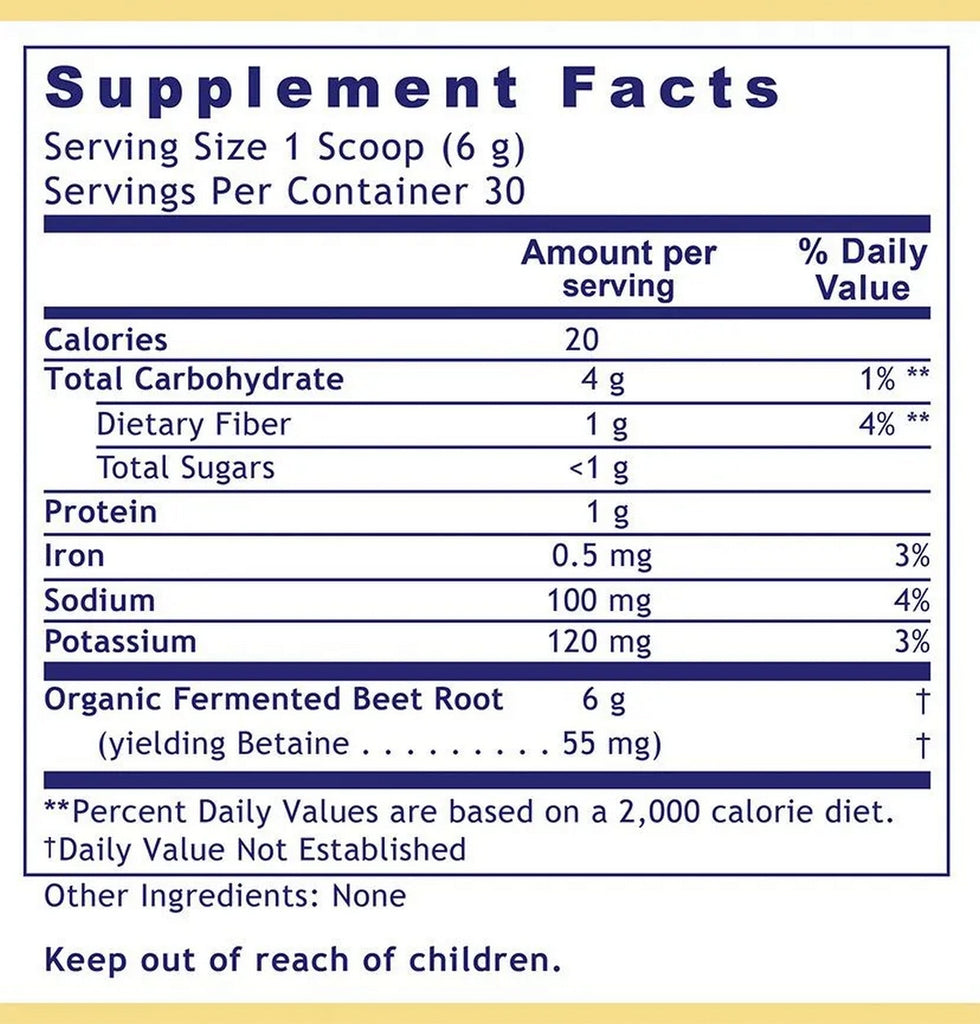 Organic whole beets are ground to a fine powder and fermented with probiotics to enhance bioavailability, decrease sugar, and increase nitrate content. A Keto Friendly formula that supports cardiovascular health, athletic performance, and stamina.