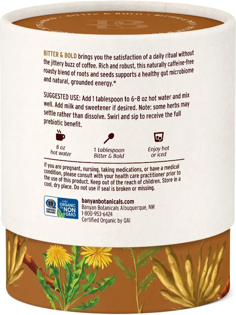 Creamy & Hot: Mix 6 oz hot water with 1 tablespoon Bitter & Bold. Add 2 oz milk or cream, 1 teaspoon ghee (optional), and your favorite sweetener. Stir well.
