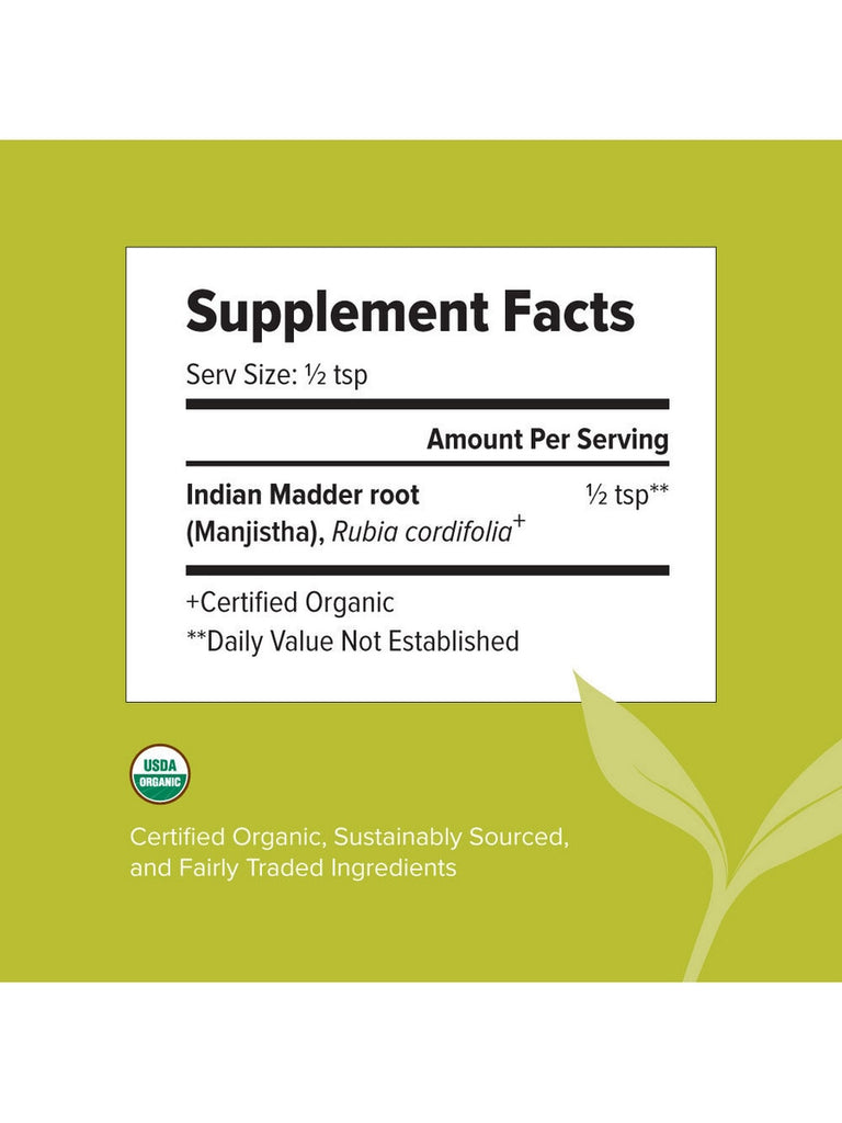 Manjistha (Rubia cordifolia) is the quintessential blood purifier in the Ayurvedic pharmacopoeia. It removes excess heat and natural toxins from the blood helping to support healthy skin and a clear complexion. It is one of the best pitta-pacifying herbs and is used to support the proper function of the liver and kidneys. Manjistha is also excellent for reducing excess kapha. It helps to maintain clear channels in the body supporting the healthy flow of blood and urine.