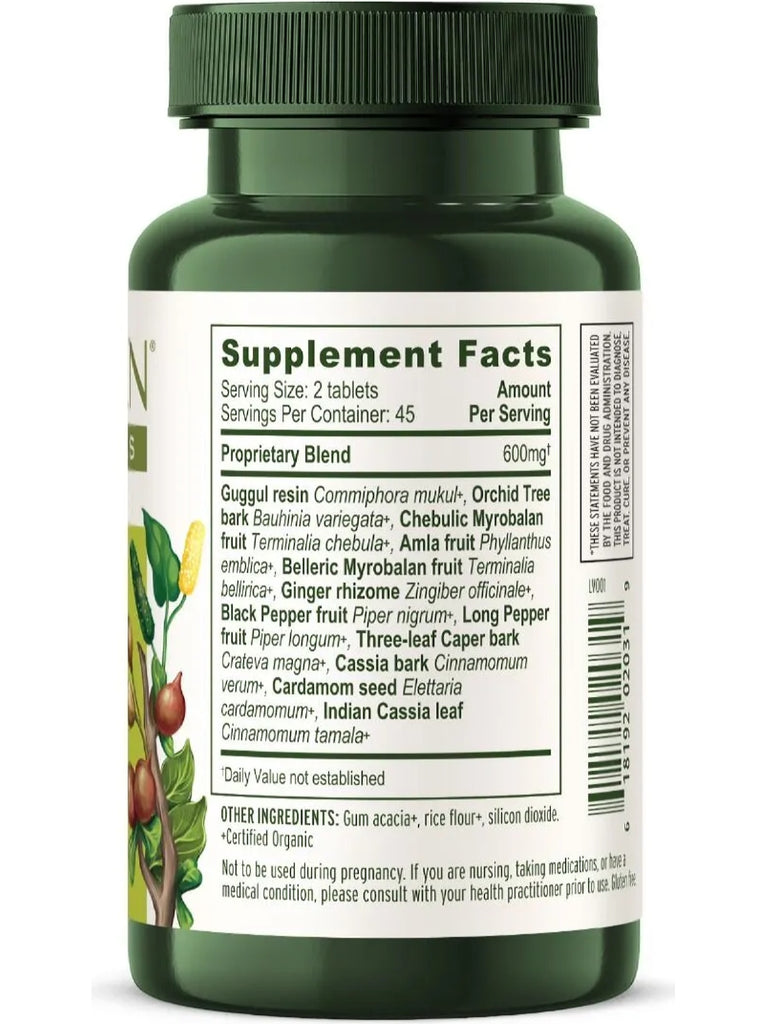 Each 300 mg tablet contains: Guggulu resin (Commiphora mukul), Kanchanar herb (Bauhinia variegata), Amalaki fruit (Emblica officinalis), Bibhitaki fruit (Terminalia belerica), Haritaki fruit (Terminalia chebula), Pippali fruit (Piper longum), Ginger root (Zingiber officinale), Black Pepper fruit (Piper nigrum), Varuna bark (Crataeva nurvalasa), Cardamom seed (Elettaria cardamomum), Cinnamon herb (Cinnamomum cassia), Bay leaf (Cinnamomum tamala).
