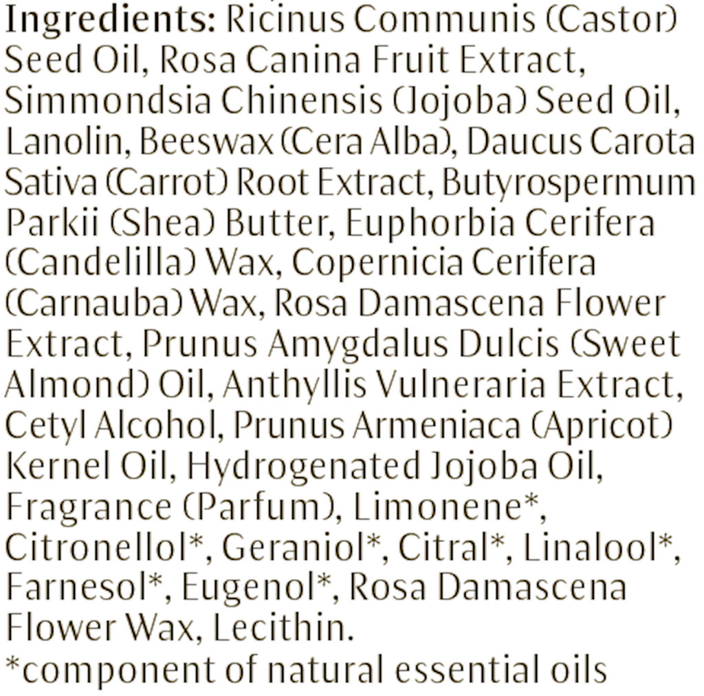 Formulation: Unlike conventional lip care products, this formulation promotes healthy lips without causing dependency. Candelilla and carnauba waxes and sweet almond and apricot kernel oils seal in moisture to soften and smooth dry lips. Antioxidant shea butter with rose petal, rose hip, anthyllis and carrot extracts fortify, soothe and soften.