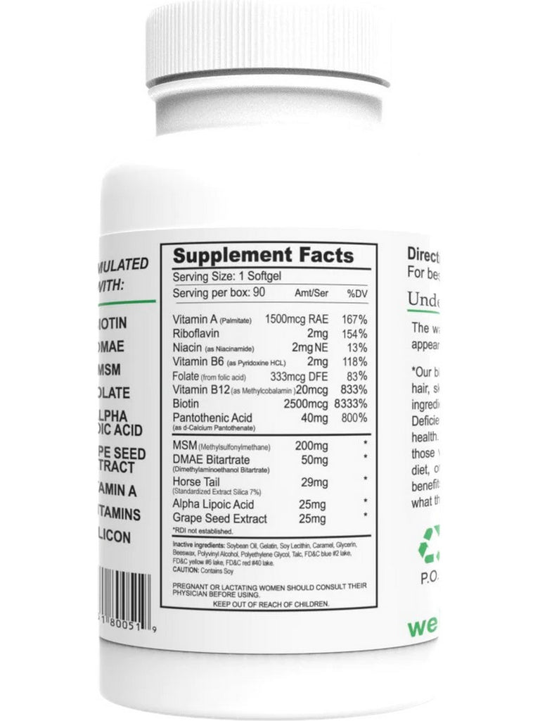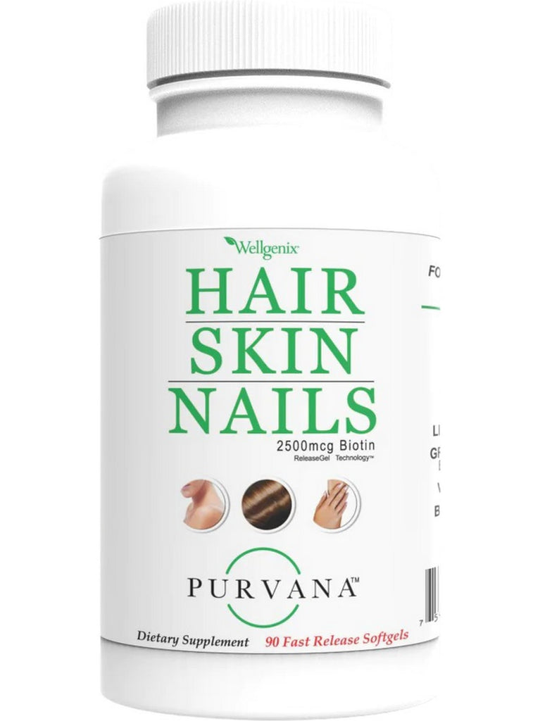 Purvana Hair, Skin, and Nails fast release Softgels are formulated with 2500mcgs of high potency Biotin, MSM, Horse Tail Extract, DMAE and Grape Seed Extract to promote thicker & fuller hair, stronger nails, and glowing skin. This multi-effective formula helps increase collagen production to minimize fine lines and wrinkles, improve elasticity, strengthen nails beds, and slow hair loss. Purvana Hair, Skin, and Nails contains vital nutrients to support a more youthful looking appearance in just one Softgel a day!