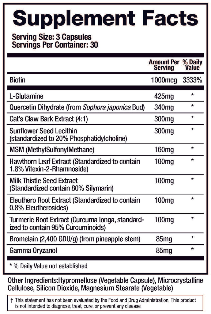 As a dietary supplement, take 3 capsules daily, before breakfast or lunch, or as recommended by your health care professional. Higher doses are indicated for helping with the repair of a chronic leaky gut.