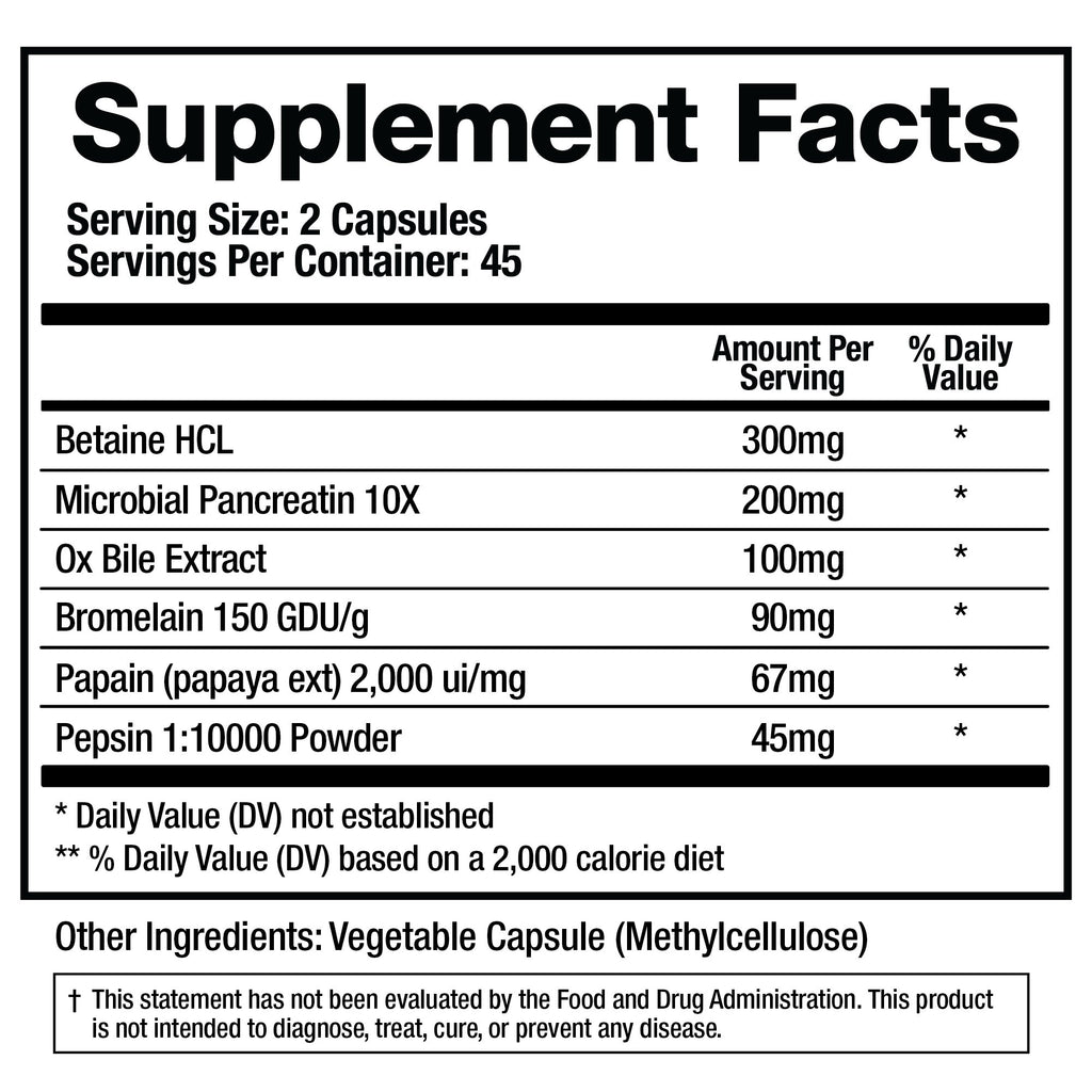 - Contains plant enzymes as well as pancreatin and ox bile extract, to optimize gastric acid levels and meat protein digestion