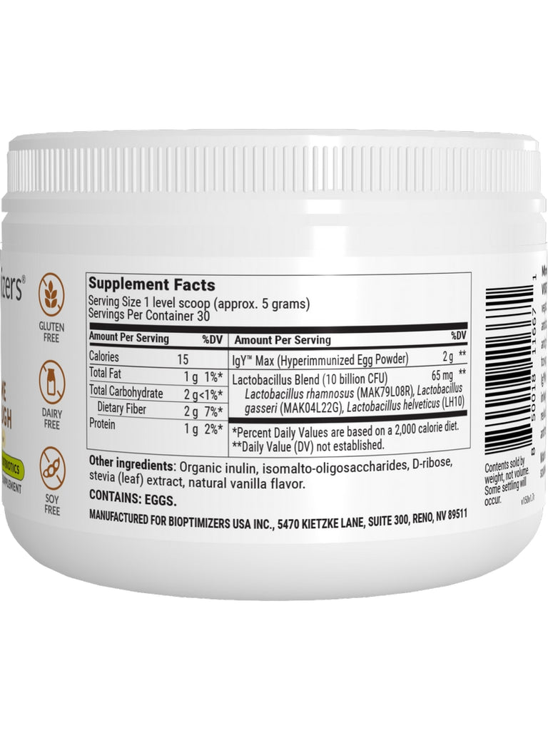 Microbiome Breakthrough Vegetarian Vanilla is a powerful combination of IgYmax and synbiotics (probiotics and prebiotics). It is synergistically designed to weed out suboptimal bacteria and reseed the good ones, as well as repair the gut lining.