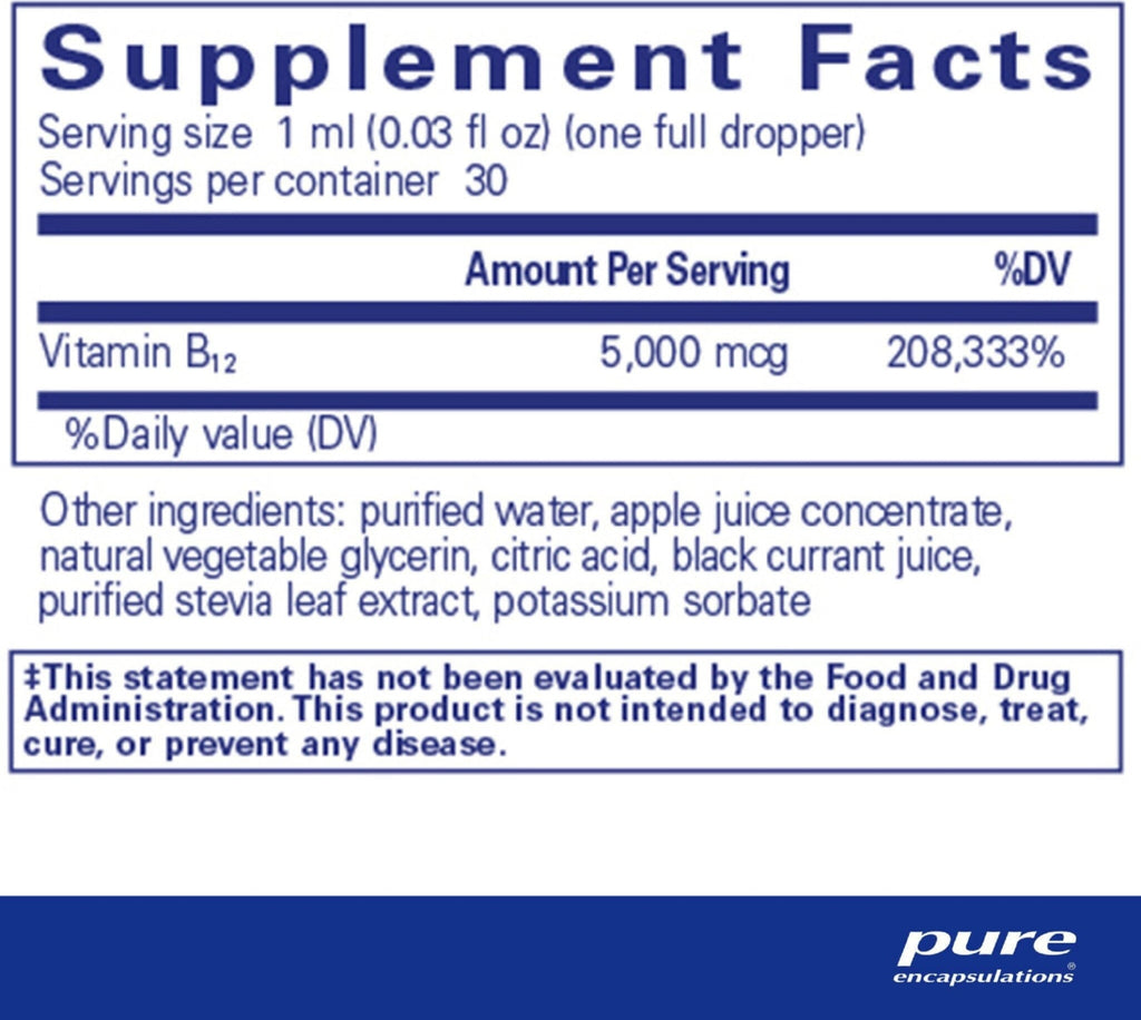 Pure Encapsulations' B-12 5000 liquid contains methylcobalamin, the active form of B-12. Combined with a healthy diet, this liquid provides essential B-12 vitamin for healthy nerve and cognitive function, boosts immune system as well as memory and emotional wellbeing.
