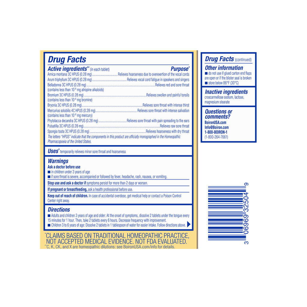 Instead of merely numbing pain, Boiron ThroatCalm tablets relieve minor sore throat associated with colds and hoarseness from overused vocal cords. The homeopathic tablets dissolve under the tongue, causing no additional pain to swallow.