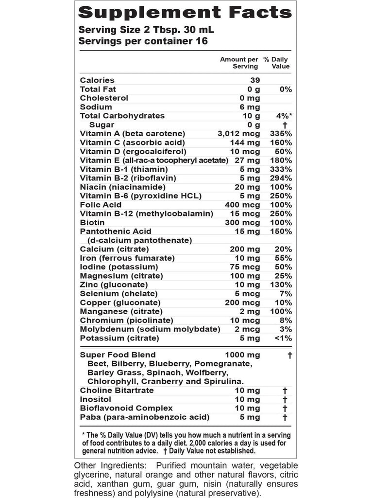 Our Children’s Daily Liquid Multivitamin is formulated to provide nutrients and support for your growing child. This supplement includes vitamins such as A, C, D, E, and B-complex, as well as minerals like calcium, iron, iodine, magnesium, zinc, selenium, copper, manganese, chromium, molybdenum, and potassium. Each serving also contains a Super Food Blend.