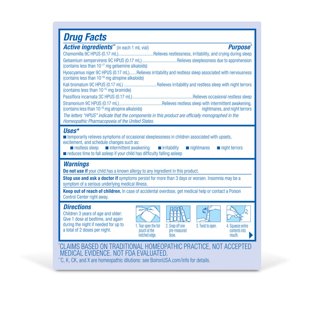 Sweet dreams are just a squeeze away with SleepCalm Kids. This homeopathic sleep aid calms occasional restless sleep without melatonin, so your child can fall asleep and stay asleep without feeling groggy the next day. It uses a blend of plant-based and other pure active ingredients that help restore a natural sleep pattern disturbed by upsets, excitement, and schedule changes. Simply squeeze the small, Pre-Measured dose into your child’s mouth before bed or anytime during the night for calming relief.