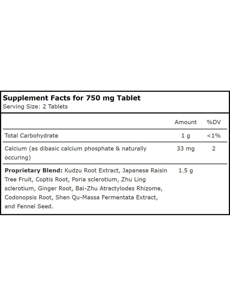 Proprietary Blend: Kudzu Root Extract, Japanese Raisin Tree Fruit, Coptis Root, Poria sclerotium, Zhu Ling sclerotium, Ginger Root, Bai-Zhu Atractylodes Rhizome, Codonopsis Root, Shen Qu-Massa Fermentata Extract, and Fennel Seed. 1.5 g