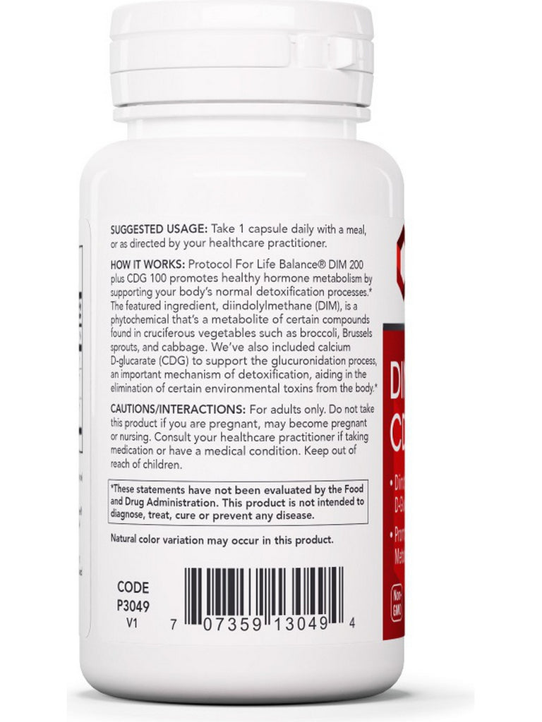 Protocol For Life Balance DIM 200 plus CDG 100 promotes healthy hormone metabolism by supporting your body's normal detoxification processes. The featured ingredient, diindolylmethane (DIM), is a phytochemical that's a metabolite of certain compounds found in cruciferous vegetables such as broccoli, Brussels sprouts, and cabbage. We've also included calcium D-glucarate (CDG) to support the glucuronidation process, an important mechanism of detoxification, aiding in the elimination of certain environmental toxins from the body.