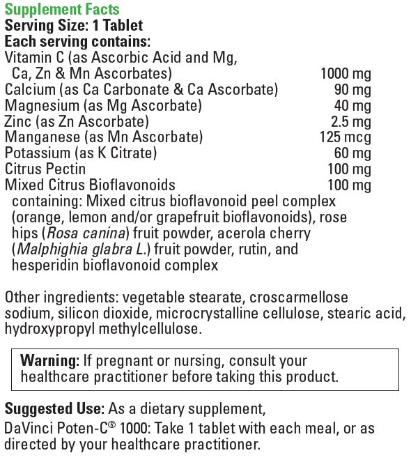DaVinci Poten-C® formulas are designed to maximize absorption and utilization of this essential vitamin. Vitamin C in DaVinci Poten-C® is in the buffered Ascorbate form. That buffer helps to prevent the stomach irritation common when supplementing with plain ascorbic acid found in over the counter Vitamin C supplements. Poten-C® formulas also contain minerals and bioflavonoids that help increase the effectiveness of Vitamin C by 50%.