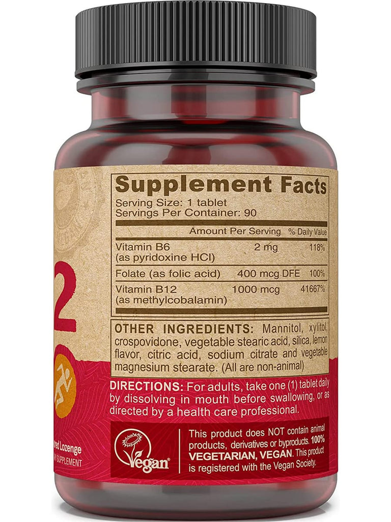 Vitamin B12 is highly beneficial in various forms but DEVA Fast Dissolve B-12 contains only one form: Methylcobalamin. Methylcobalamin, the coenzyme form of vitamin B12 is a body-friendly version and can be used in its normal form. Our product comes as a small fast disintegrating tablet that can dissolve in the mouth before swallowing so people who have difficulty swallowing pills can take it easily as well. Each fast dissolve lozenge tablet provides 1000 mcg (41,667% of Daily Value) to ensure adequate intake. Deva B12 lozenges are also a potent source of Vitamin B6 and Folic Acid for those who want to combine the three vitamins for added benefits. Tablets are pleasant tasting, dissolve in a short amount of time and, can also be chewed if desired.