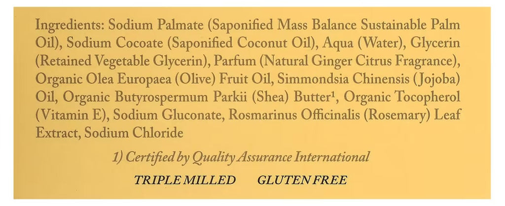 Excitable and Smooth. Our 100% Natural Ginger Citrus Soap awakens and restores. Energizing Ginger combines with Lemon, Orange and Lime to engage your senses, while a soothing blend of Organic Jojoba and Olive Oils, Organic Shea Butter and Vitamin E moisturizes and conditions your skin.