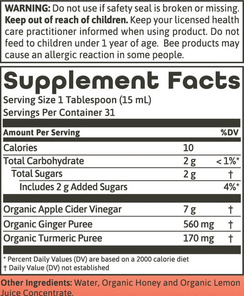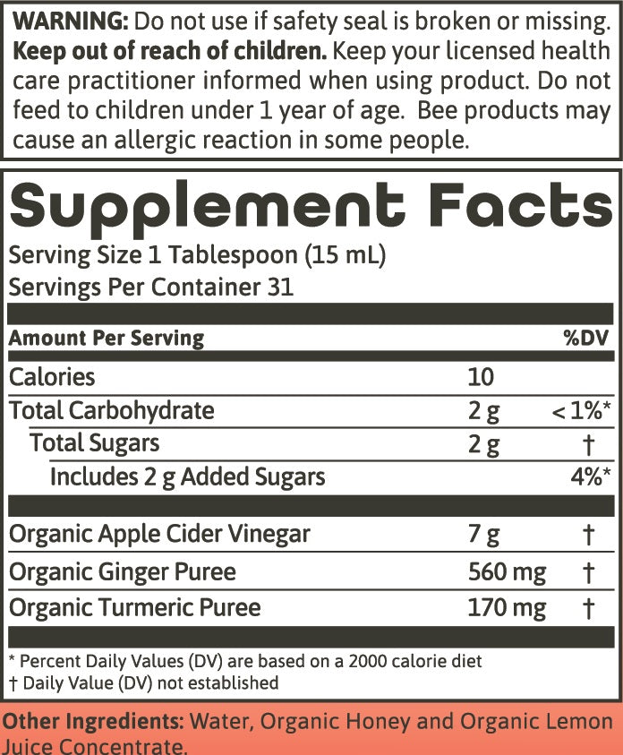 1 tbsp (15 mL) of Organic Apple Cider Vinegar. May be mixed with water, seltzer, juice or a beverage of your choice. Take with at least 250ml (8 oz) of liquid.