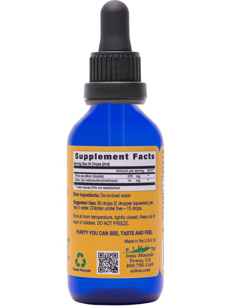 Eidon Joint Support is a combination of Silica and Sulfur, both essential for supporting joint health. They are the active mineral ingredients in glucosamine sulfate and chondroitin sulfate. Silica and Sulfur are the two most important minerals required by the body to produce glycosaminoglycans, the main building blocks of collagen and connective tissue.