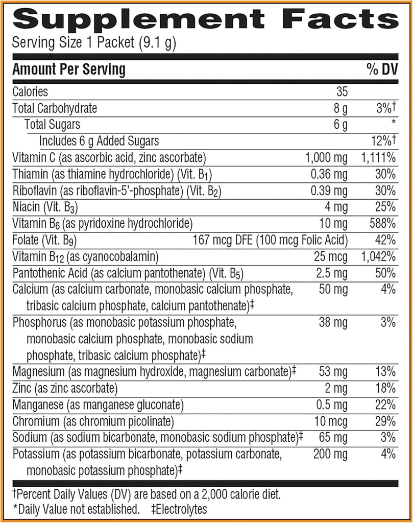 Emergen-C Super Orange delivers a fizzy, citrus-y burst of essential nutrients including Vitamin C and B vitamins, to help make it a super day.