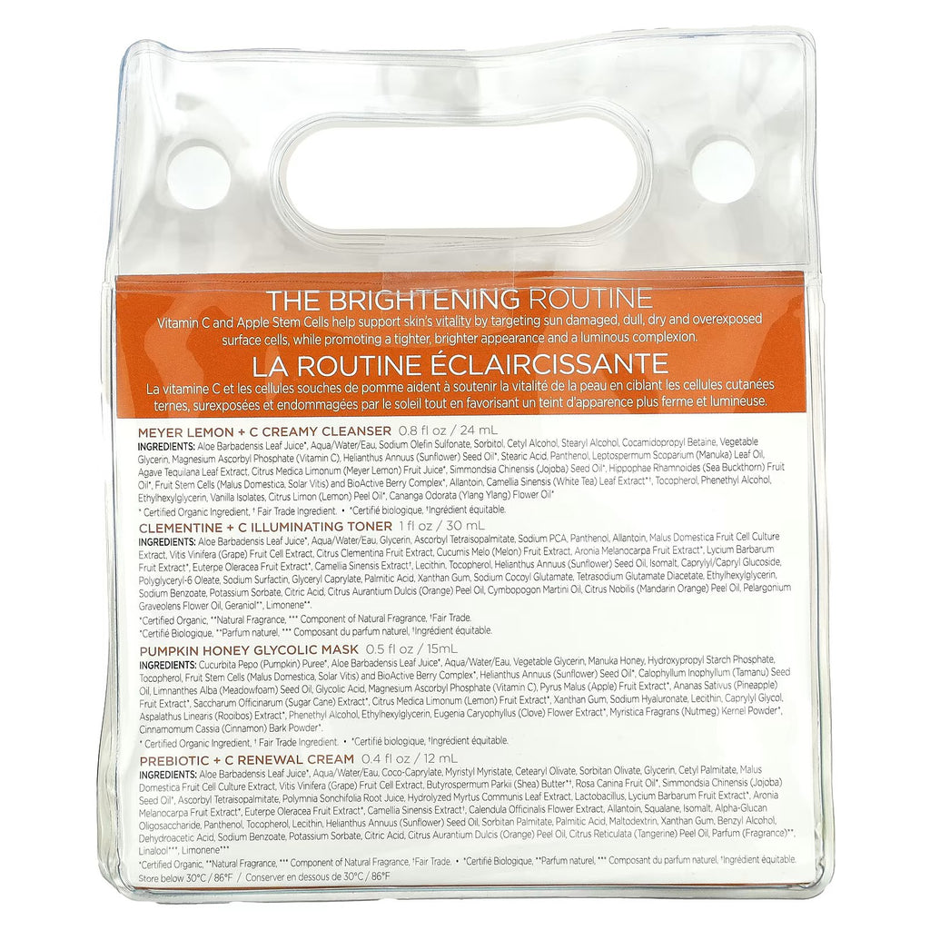 A travel-sized skin care routine of Brightening essentials, featuring Vitamin C and Apple Stem Cells to help support skin’s vitality by targeting sun damaged, dull, dry and overexposed surface cells, while promoting a tighter, brighter appearance and a luminous complexion.