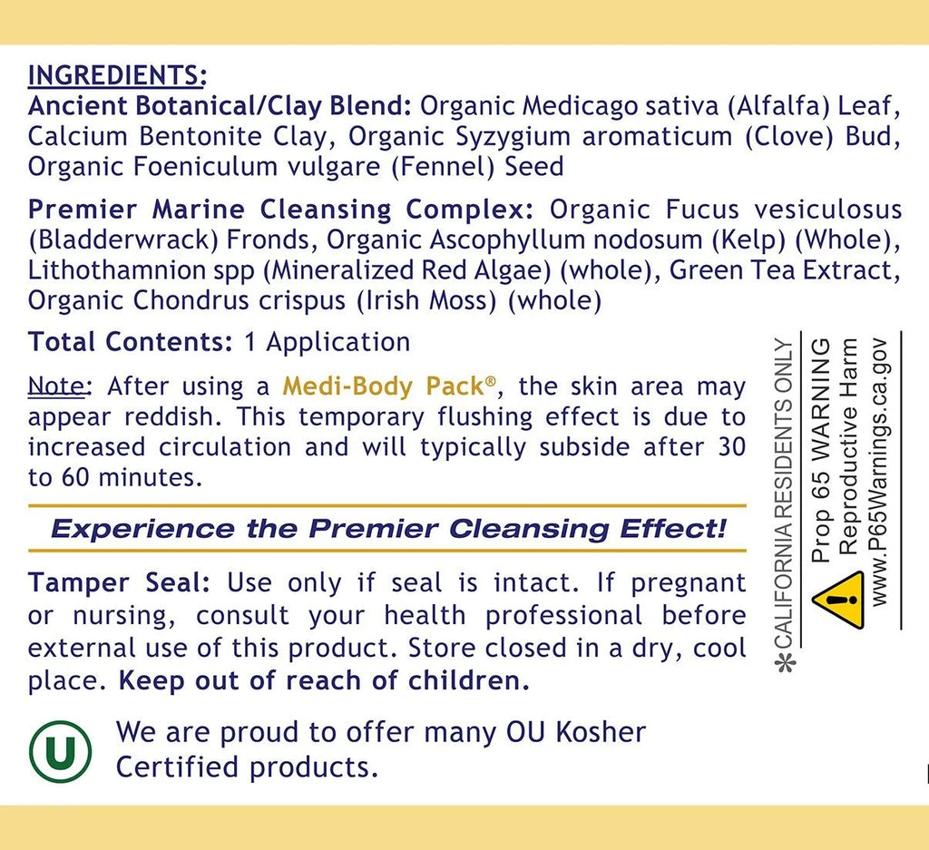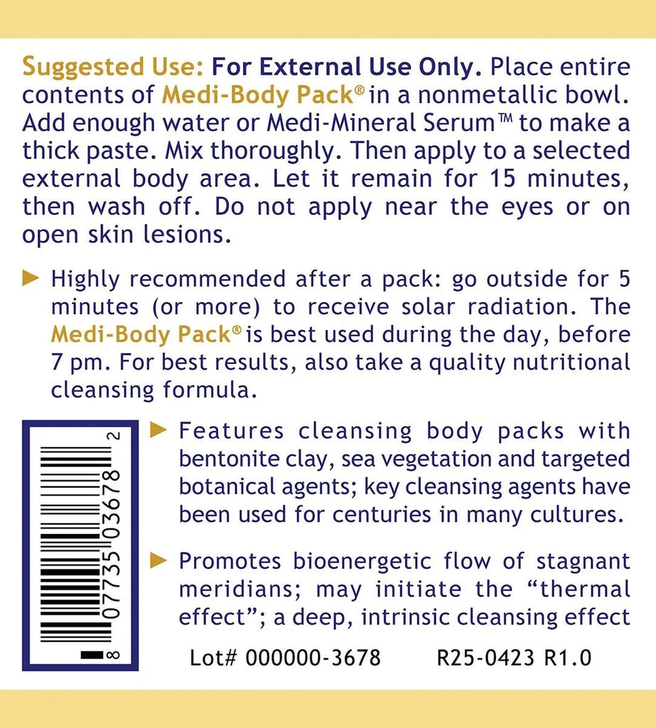For External Use Only. Place 2 tablespoons of Medi-Body Pack® in a nonmetallic bowl. Add enough water or Medi-Mineral Serum™ to make a thick paste. Mix thoroughly. Then apply to a selected external body area. Let it remain for 15 minutes, then wash off. Do not apply near the eyes or on open skin lesions.