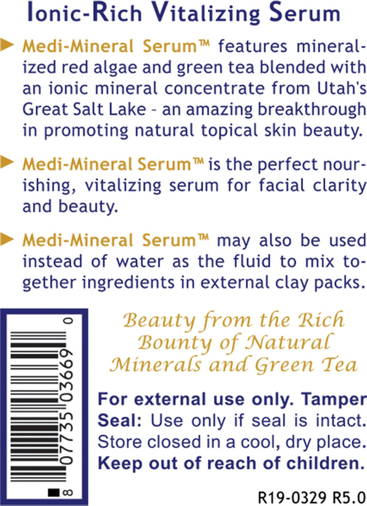 Medi-Mineral Serum is a soothing serum designed to nourish and vitalize the skin, especially the face, for clarity and beauty. This serum features green tea extract for polyphenols, sea salt, mineral concentrate and mineralized algae.