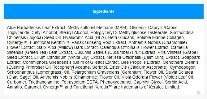 MSM Rejuvenator contains a special blend of aloe vera, MSM (methyl sulfonyl methane), topical vitamin C, hyaluronic acid (HLA), Cynergy Functional Keratin, natural oils, and botanical extracts. This combination rejuvenates and moisturizes skin and reduces the appearance of wrinkles. It provides prompt relief from sun and wind exposure. It also stimulates nail growth.