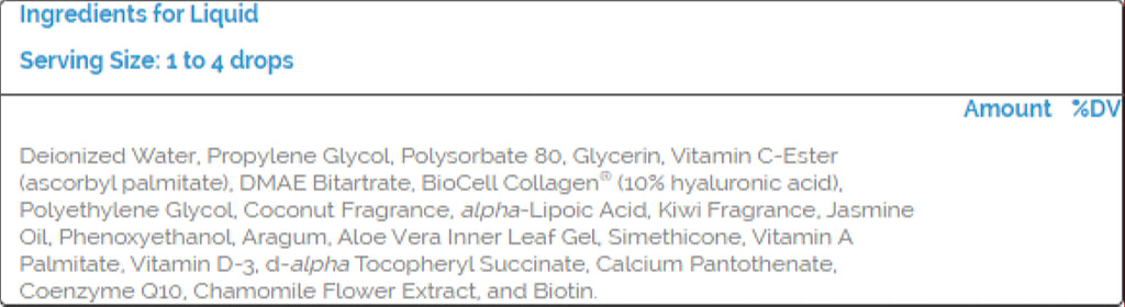 Deionized Water, Propylene Glycol, Polysorbate 80, Glycerin, Vitamin C-Ester (Ascorbyl Palmitate), DMAE, Polyethylene Glycol, Glycolic Acid, alpha-Lipoic Acid, Lemon Oil, Lavender Oil, Aloe Vera, Biotin, Vitamin A, Vitamin D-3, Coenzyme Q10, Vitamin E, Calcium Pantothenate, Chamomile Flower Extract, Simethicone, Phenoxyethanol, and Aragum. -