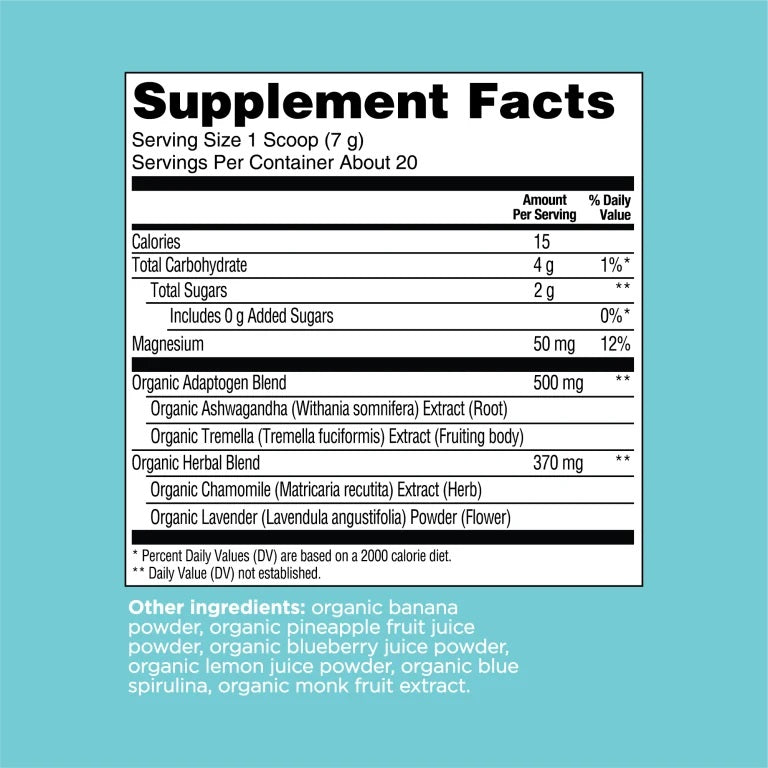 500mg organic adaptogens join forces with magnesium and the fresh flavors of blueberries and lavender. Just mix with cold water for a caffeine-free way to de-stress.