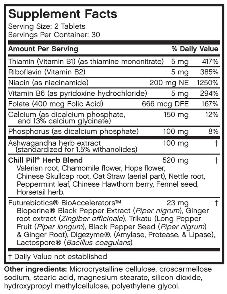 Futurebiotics exclusive Chill Pill formulation has been designed to provide an all-natural, non-addictive source of relaxation and calmness. Our lives are more stressful than ever before with an ever-increasing amount of personal and professional commitments fighting for our attention. Stress can affect our bodies in both the short and long term, stressing your immune, digestive, and reproductive systems. Our natural relaxation supplements are made with powerful herbs and botanicals including Valerian root, Chamomile, Hops, Nettle, Fennel and Skullcap, which all help to support relaxation and stress. Our calming supplement now also includes adaptogenic Ashwagandha, which has been shown to support healthy cortisol levels. Take one to two tablets daily as needed or as directed by a healthcare professional.