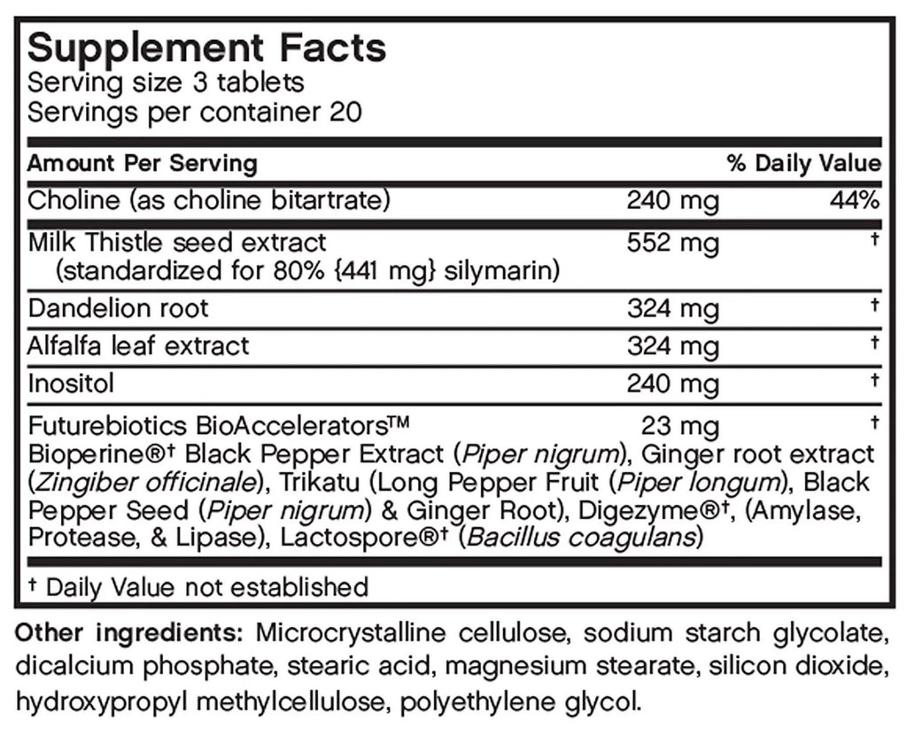The liver is one of the most important organs in the body. It provides essential detoxifying and filtration processes that help the body get rid of unhealthy toxins. It also plays a critical process in aiding the body with digestion, helping to produce energy, and blood production. The liver is important to the body's overall ability to function effectively and efficiently. Futurebiotics Silymarin Plus Liver Support supplement is formulated with lignan flavonoids unique to Milk Thistle that have been shown to help support liver function, protect the liver from free radicals, and help protect the liver from the damaging effects of toxins. Our Silymarin supplements contain 525mg of Milk Thistle seed extract, as well as Beetroot, and Dandelion root, which have both been traditionally used to support the liver and detoxification. Futurebiotics exclusive Bioaccelerators improve bioavailability, while digestive enzymes help promote digestion and nutrient absorption. Take three tablets daily with meals or as directed by a healthcare professional.