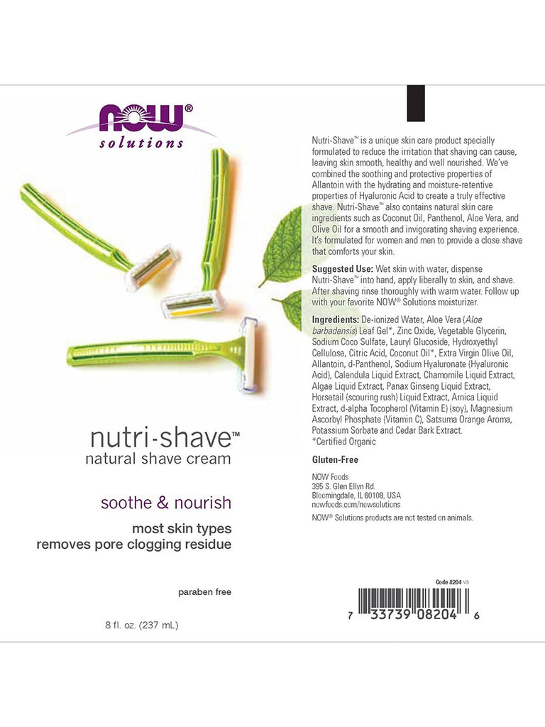 Wet skin with water, dispense Nutri-Shave™ into hand, apply liberally to skin, and shave. After shaving rinse thoroughly with warm water. Follow up with your favorite NOW® Solutions moisturizer.