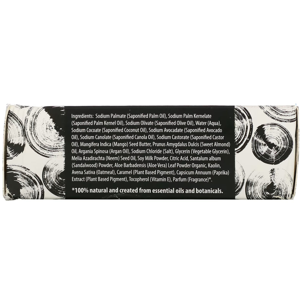 Ingredients: Sodium Palmate (Saponified Palm Oil), Sodium Palm Kernelate (Saponified Palm Kernel Oil), Sodium Olivate (Saponified Olive Oil), Water (Aqua), Sodium Cocoate (Saponified Coconut Oil), Sodium Avocadate (Saponified Avocado Oil), Sodium Canolate (Saponified Canola Oil), Sodium Castorate (Saponified Castor Oil), Mangifera Indica (Mango) Seed Butter, Prunus Amygdalus Dulcis (Sweet Almond) Oil, Argania Spinosa (Argan Oil), Sodium Chloride (Salt), Glycerin (Vegetable Glycerin), Melia Azadirachta (Neem) Seed Oil, Soy Milk Powder, Citric Acid, Santalum album (Sandalwood) Powder, Aloe Barbadensis (Aloe Vera) Leaf Powder Organic, Kaolin, Avena Sativa (Oatmeal), Caramel (Plant Based Pigment), Capsicum Annuum (Paprika) Extract (Plant Based Pigment), Tocopherol (Vitamin E), Parfum (Fragrance)*.