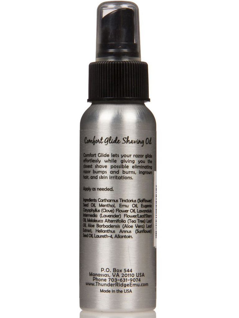 Thunder Ridge's Comfort Glide Shaving Oil conditions and lubricates the skin creating a smooth, comfortable shave. Combining Emu Oil with other essential herbal oils lets your razor glide effortlessly giving you the closest shave possible and it eliminates razor bumps, razor burns and skin irritation.