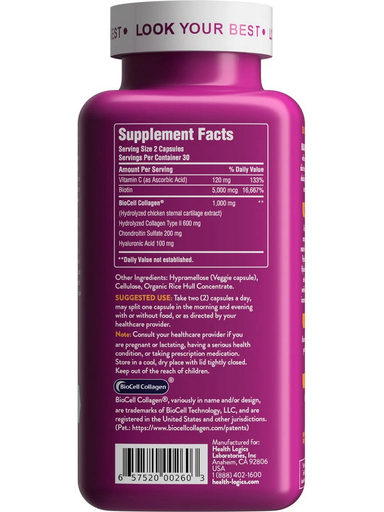 Health Logics brings you its most advanced hair, skin, and nails formula that combines the power of collagen peptides, hyaluronic acid (HA), chondroitin sulfate with Vitamin C and Biotin. Collagen and HA are vital components of skin that decline as we age and are responsible for the skin's moisture, suppleness, elasticity, vibrancy, and beauty. Vitamin C supports collagen formation in the body and acts as an antioxidant to help neutralize free radicals. Biotin promotes hair and nail health.