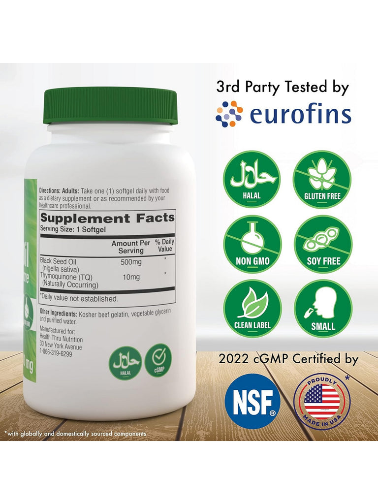 Health Thru Nutrition Black Seed Oil 500mg softgels with 2% thymoquinone is a high-quality dietary supplement that offers a range of potential health benefits. Made from pure organic Nigella sativa seeds, this supplement is cold-pressed to ensure maximum potency and purity. Each softgel contains 500mg of black seed oil, along with 2% thymoquinone, a powerful antioxidant that may help support immune function and overall health.