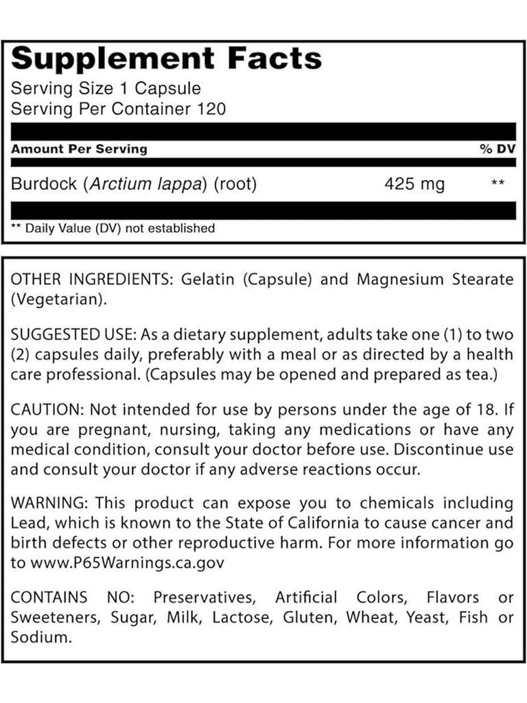 With the Herbal Secrets Burdock Root Herbal support Dietary Supplement, you may be able to give your body the antioxidants it needs for a healthier state of being. The burdock root plant inside of these supplements is known to benefit the blood and the organs. This burdock root herb supplement comes in a dose of 425 milligrams per capsule with 120 capsules per bottle.