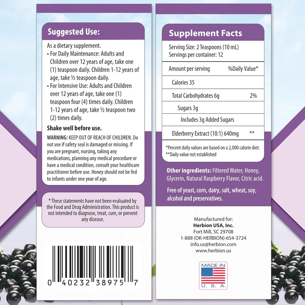 Give your immune system a daily support with Herbion Naturals Elderberry Syrup! This delicious, all-natural syrup is packed with the power of black elderberry, rich in antioxidants, to help keep you and your family healthy year-round. Great-tasting with a natural raspberry flavor and honey, it’s perfect for both adults and kids.
