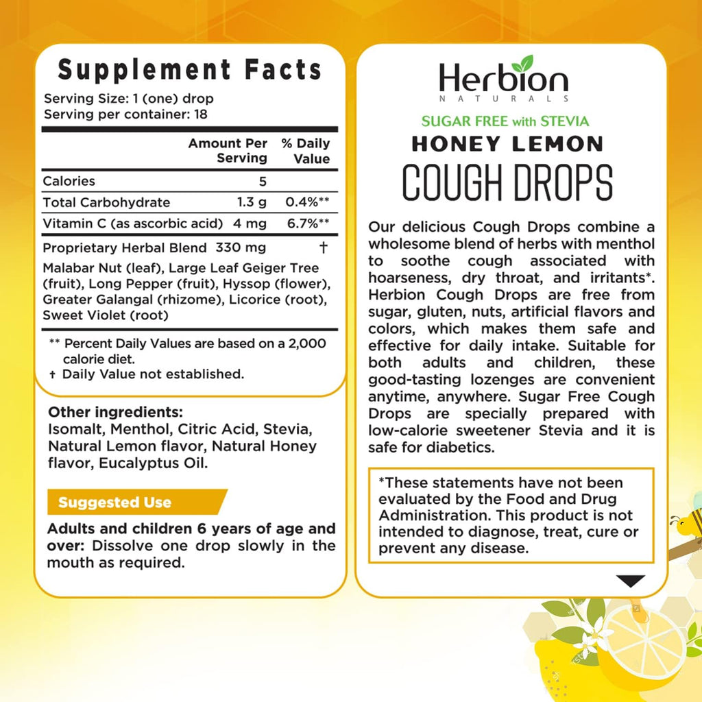 Herbion Naturals, Sugar Free with Stevia, Cough Drops, Honey Lemon, 18 Drops