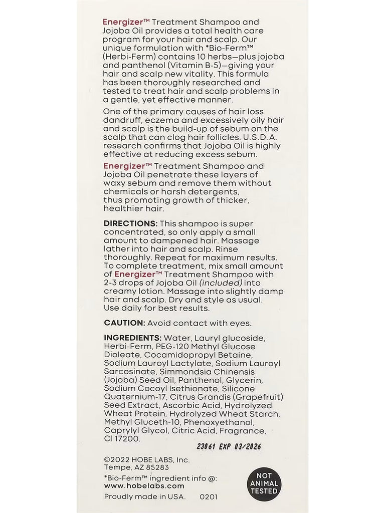 Energizer Treatment Shampoo and Jojoba Oil provides a total health care program for your hair and scalp. Our unique formulation with Bio-Ferm (Herbi-Ferm) contains 10 herbs-plus jojoba and panthenol (Vitamin B-5)-giving your hair and scalp new vitality. This formula has been thoroughly researched and tested to treat hair and scalp problems in a gentle, yet effective manner.