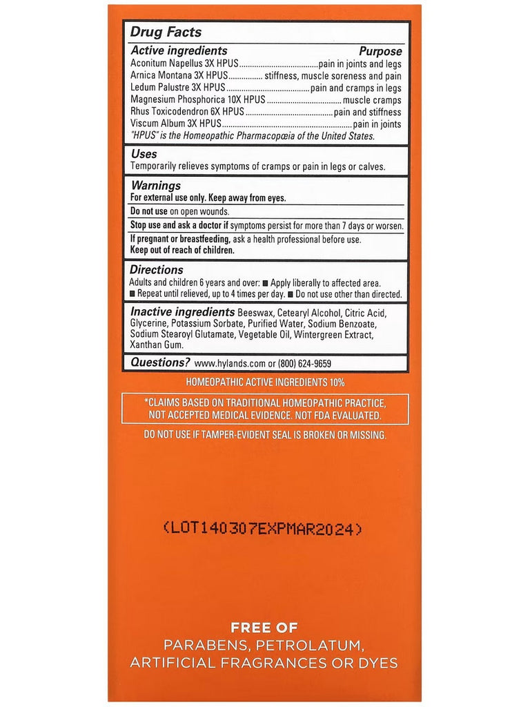 Hyland's Leg Cramps ointment helps temporarily relieve leg, calf, and foot cramps. Our formulas are made with natural active ingredients and contain no parabens, petrolatum, artificial fragrances or dyes.
