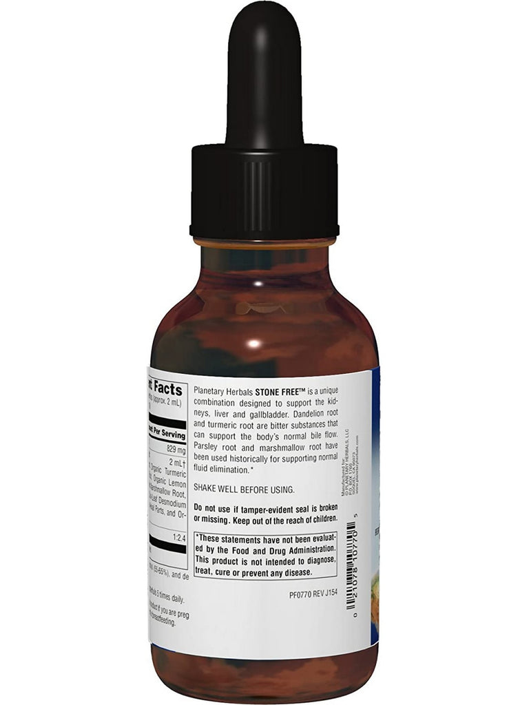 In dealing with the elimination of waste and toxic substances from the body, the kidneys, liver and gallbladder can, over time, become overburdened. Planetary Herbals offers you Stone Free, a unique blend of turmeric root, coin-leaf desmodium, lysimachia, dandelion root extract, ginger root, lemon balm leaf, marshmallow root, parsley root, dandelion root, and licorice root. These herbs have been used historically to support the kidneys, liver and gallbladder and promote healthy organ function.