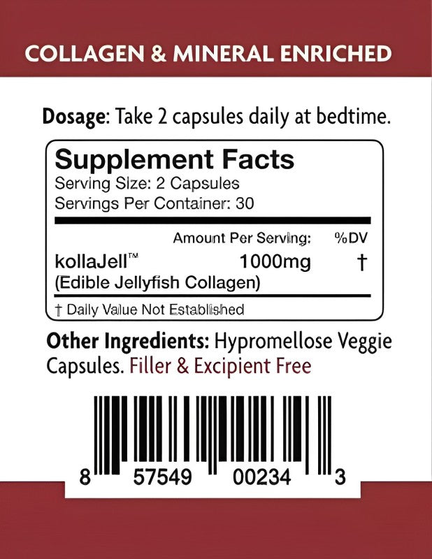 • Nutraceuticals from nature. Collagen & mineral enriched. Edible Jellyfish collagen. KollaJell is an advanced proprietary blend of highly purified food grade jellyfish collagen. Edible jellyfish collagen uniquely supplies the body with special nutrients of collagen and naturally occurring minerals that bind to collagen proteins throughout the extracellular matrix. Newly discovered jellyfish collagen peptides that aids in brain and memory vitality. Filler & excipient free.